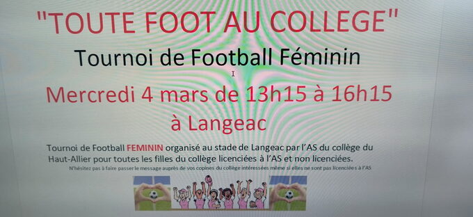 Par David Rue, publié le mardi 10 février 2026 09:12 - Mis à jour le mardi 10 février 2026 09:15L'Association Sportive du collège organise le 4 mars à Langeac l'opération "TOUTE FOOT". "Toute Foot au Collège " est un programme ouvert à toutes les Associations Sportives (A.S.) des collèges et s'adresse aux collégiennes de la 6ème à la 3ème ! -